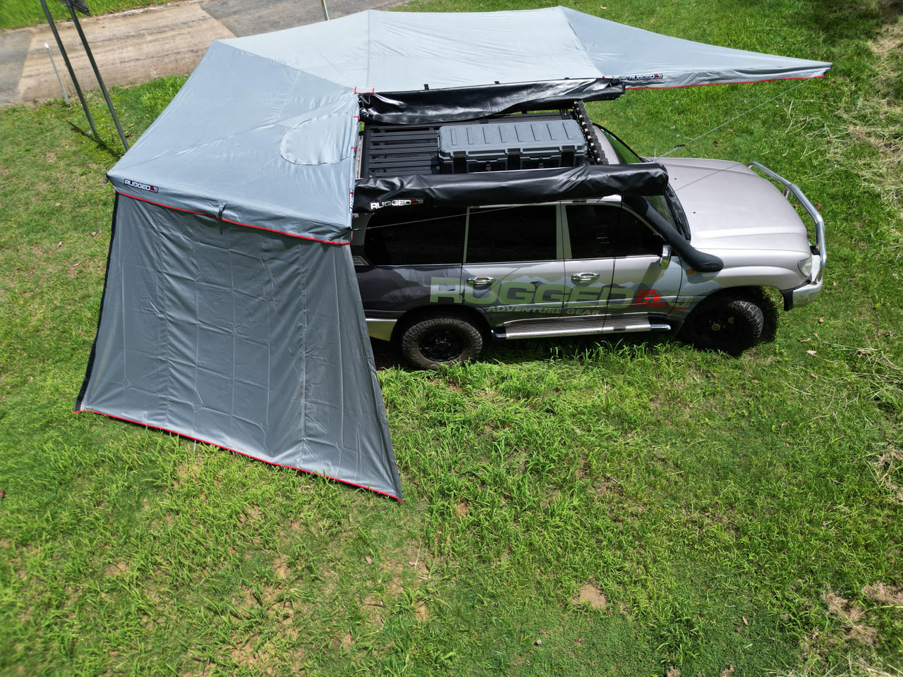 Individual wall 2.4m x 2.1m in 600D Oxford fabric with PU coating for privacy. Velcro on one end to attach to the awning and peg points on the other end to peg it down.