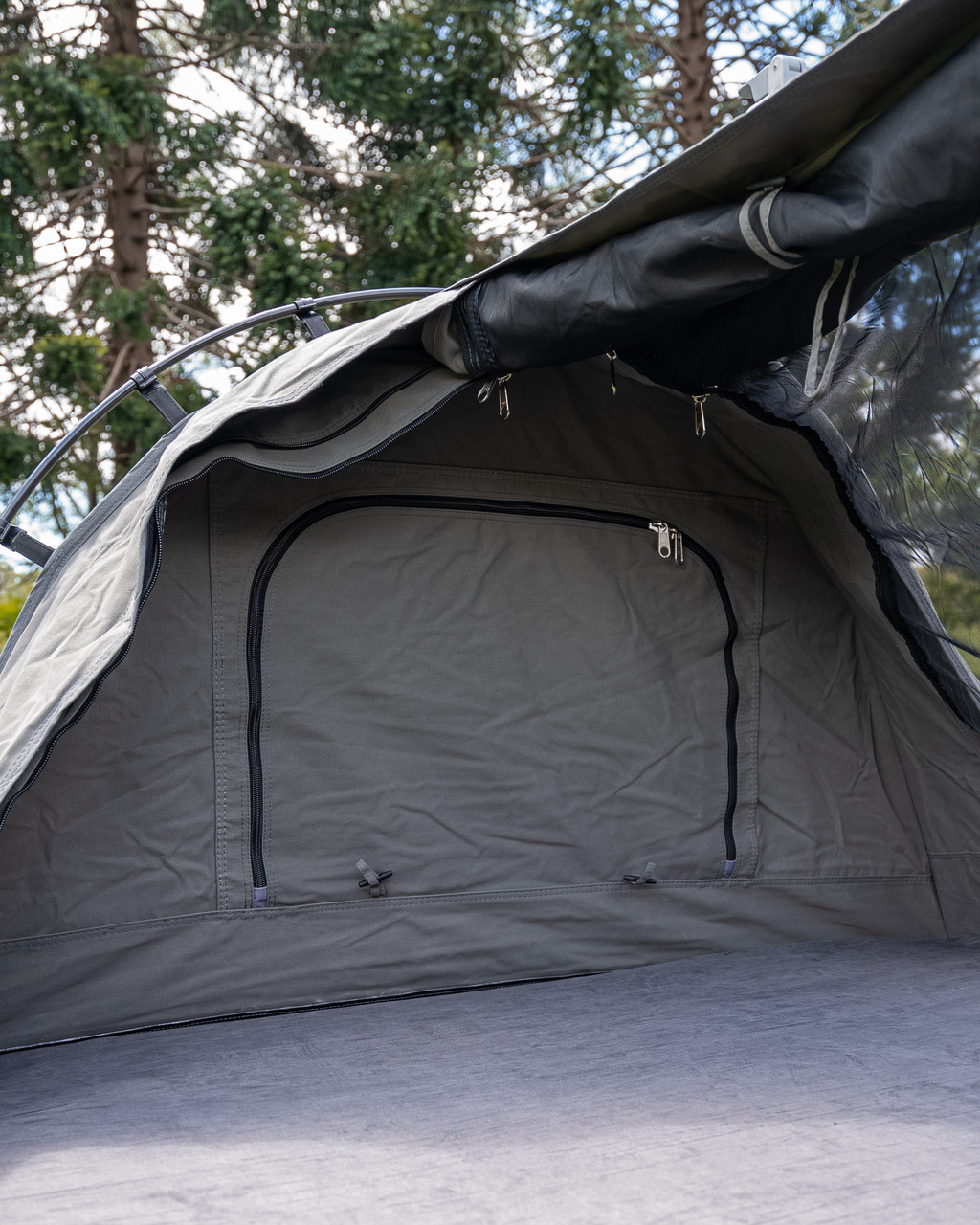 What sets the Double Pole Swag apart is its thoughtful design. Enhanced ventilation from zippered windows at each end keeps the air fresh, the unique two-way entry simplifies access and convenient overhead storage pockets to keep your belongings organised. When the stars come out, the double swag's stargazing design allows you to drift off with the cosmos in full view, while the full zip-down storm covers offer privacy and protection when needed. The inclusion of all-weather awnings adds a layer of versatility, ensuring you're prepared for any conditions.